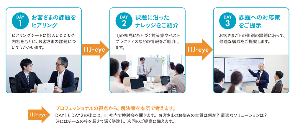 ワークショップは3日間で構成されています。初日にお客さまと対話を行ない、現状や課題を整理します。それをもとにIIJのスペシャリストが社内で状況を深く検討し、2日目に、IIJの知見にもとづく対策案やベストプラクティスなどの情報をご案内します。そして最終日に、検討内容を踏まえて、個別の課題に沿った今後の方針や実行可能なアクションをともに描き、ワークショップを締めくくります。