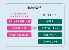 DXを成功に導くためのこれら7つの項目を、我々は「クラウド・アドプション・フレームワーク(CAF)」と呼んでいます。CAFはアマゾン(AWS)、マイクロソフト(Azure)、グーグル(Google Cloud)の3大パブリッククラウドからも提唱されていますが、これらを複合したマルチクラウドにおけるCAFは、IIJ独自のフレームワークです。