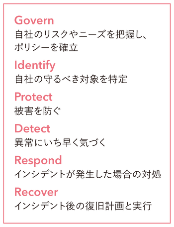 セキュリティ対策は多層防御が基本です。NIST(米国国立標準技術研究所)が策定した「NISTサイバーセキュリティフレームワーク」でも、セキュリティ脅威を完璧に防ぐことはむずかしく、事前に備えて被害を最小化し、攻撃を受けた場合は素早く復旧することが重要とされています。NISTのフレームワークでは、下記の6つの機能が示されています。