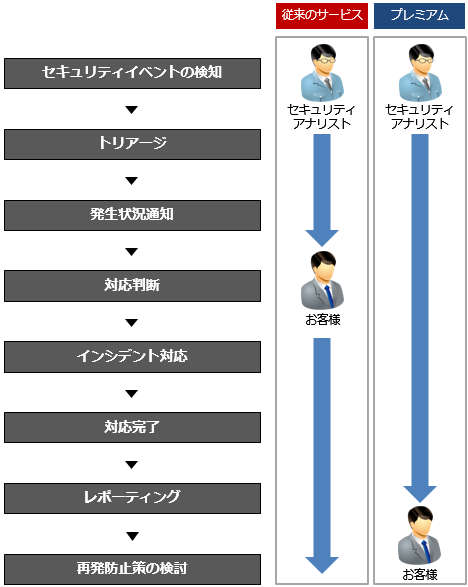 IIJ C-SOCサービスは、豊富な経験を持つIIJのセキュリティ専門エンジニアが、お客様に代わって24時間365日、IIJのSOC(セキュリティオペレーションセンター)でファイアウォールなどのセキュリティ機器を監視、セキュリティログを収集・分析し、検知したセキュリティインシデントへの対応を行うサービスです。これまでは、インシデントを検出した場合、お客様に通知し、お客様の実施判断・合意を得てから対応を行っていましたが、日々巧妙化するサイバー攻撃においては、早期発見、早期対処で影響範囲を最小限にすることが重要となってきています。また、平日深夜や休日などお客様の営業時間外にセキュリティインシデントが発生した際に初動対応を行うのはシステム管理者の負荷が大きく、アウトソースのニーズが高まっていました。このような状況を踏まえ、今回、重要なインシデントが発生した際にIIJが能動的に初動対応までを行う上位メニューとして、IIJ C-SOCサービス プレミアムを提供開始いたします。