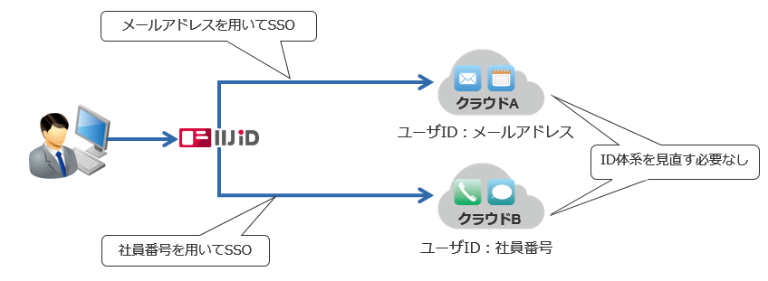 クラウドサービスによっては認証時に、IDaaSとクラウドサービス間でユーザIDを統一することが求められる場合があります。今回の機能強化により、IIJ IDサービスが、アクセス先のクラウドサービスに合わせてユーザIDを名乗れるようになり、お客様は既存のID体系を変更せずに様々なクラウドサービスと連携できます。