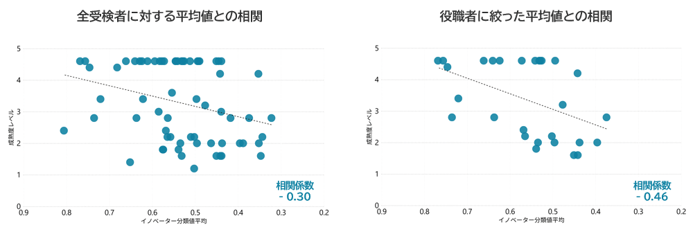 企業内でのイノベーター分類値とDX成熟度の相関関係をみると、イノベーター分類値が変革寄り(1に近い)に近づくほど、成熟度レベルが高くなるという傾向を読み取ることができ、さらに役職者に絞ることによって、その傾向が顕著になった。