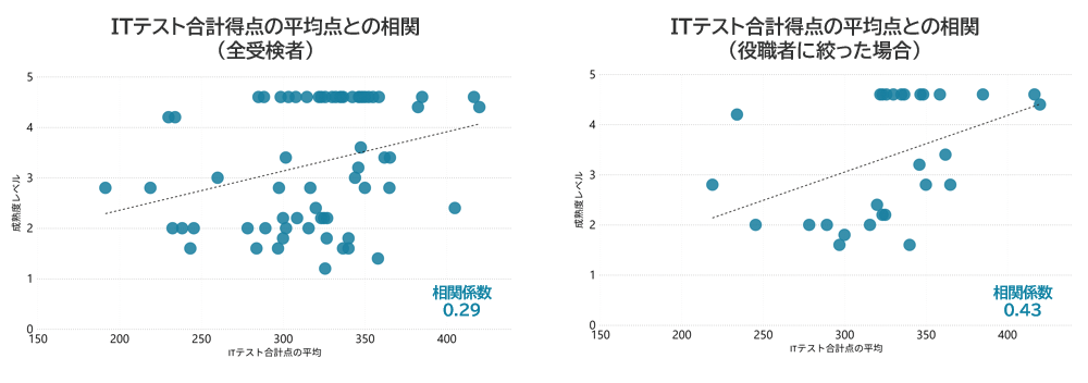 ITテストの企業内平均点と成熟度レベルの相関関係を見ると、全受検者の相関では、弱い正の相関を確認でき、役職者に絞った場合はより強い正の相関が見られる。全社のITリテラシーの高さはDXにおける成熟度に影響を与え得ることが読み取れ、特に役職者のリテラシーの引き上げが、成熟度レベルの更なる上昇に繋がると言える。