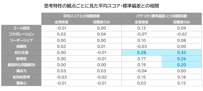 補足:特に高い相関係数(+0.2以上)を示した結果部分を青マーカーで表示。例えば右図の「バラつき(標準偏差)との相関係数」表において、「自己主張」の思考特性は相対的に高い相関係数が示されており、「自己主張の強さにばらつきがある(多様なタイプが共存している)企業ほど、DX成熟度が高い傾向にある」と読み取ることができる。
