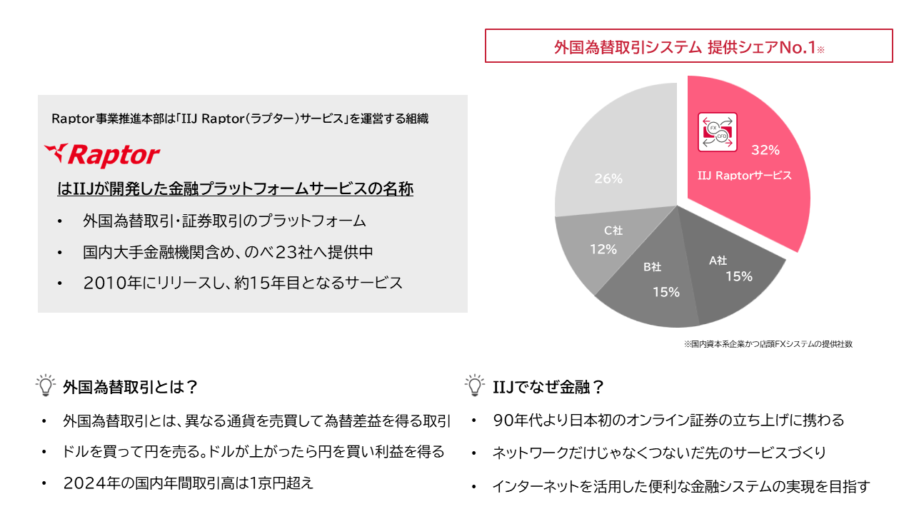Raptorサービス」を運営する組織です。Raptorとは、IIJが開発した金融プラットフォームサービスの名称で、主に外国為替取引や証券取引のプラットフォームとして、国内の大手金融機関様に提供しています。