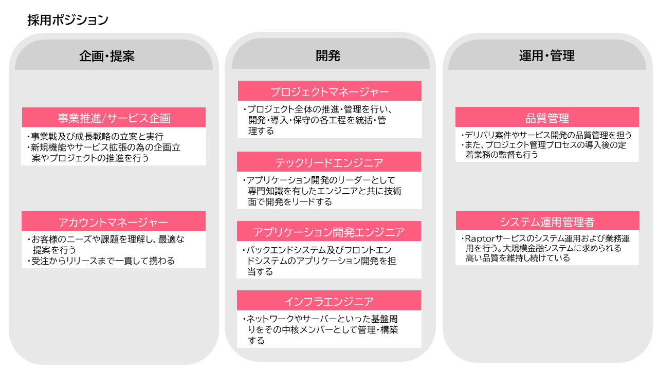 採用ポジションについてもご紹介します。企画から開発・運用まで携わるサービスですので、採用ポジションも多岐にわたります。