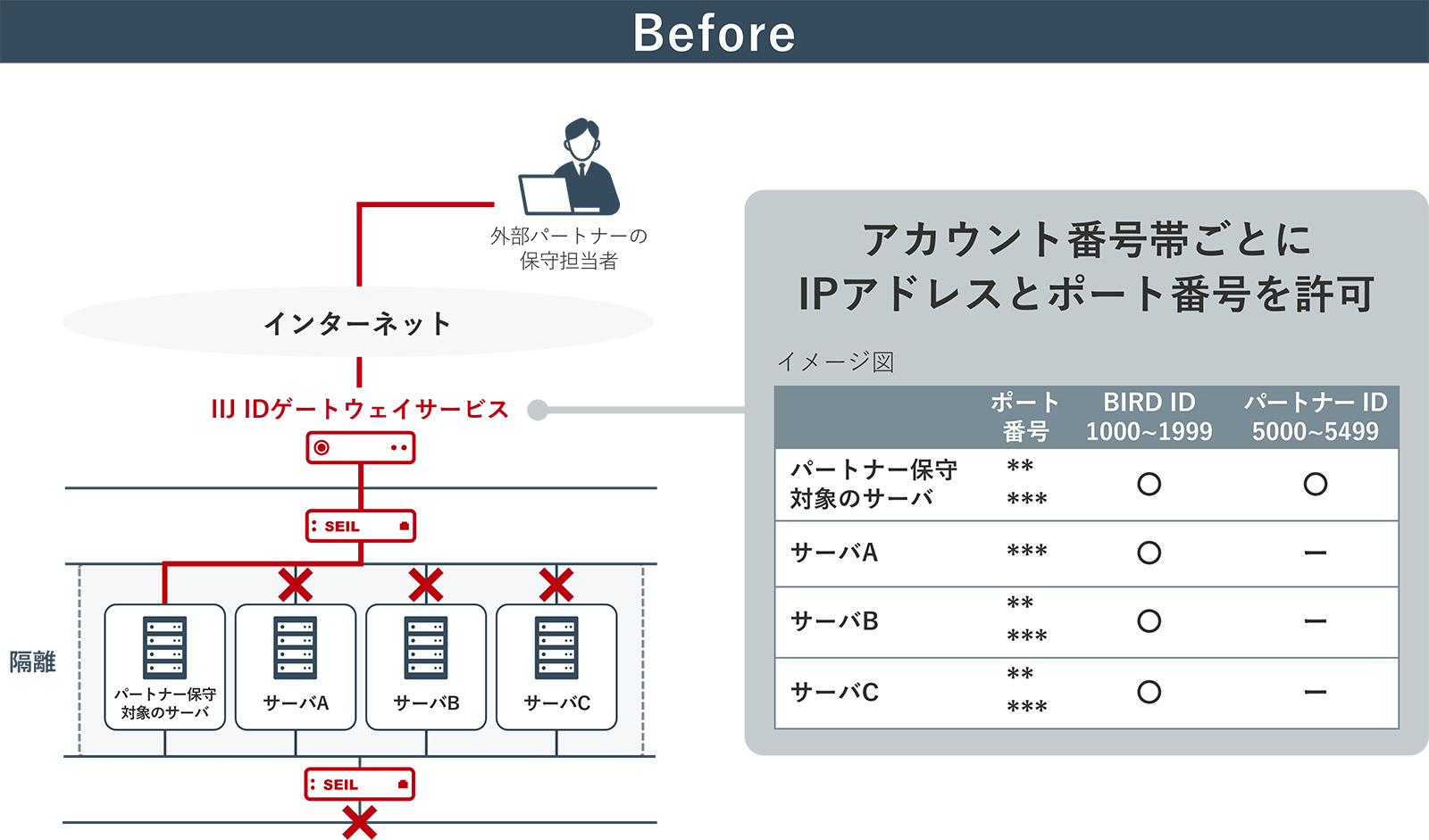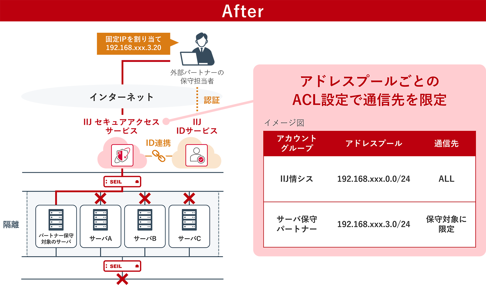 IIJセキュアアクセスサービス移行後の、パートナーの保守担当者のアクセス制御イメージ図